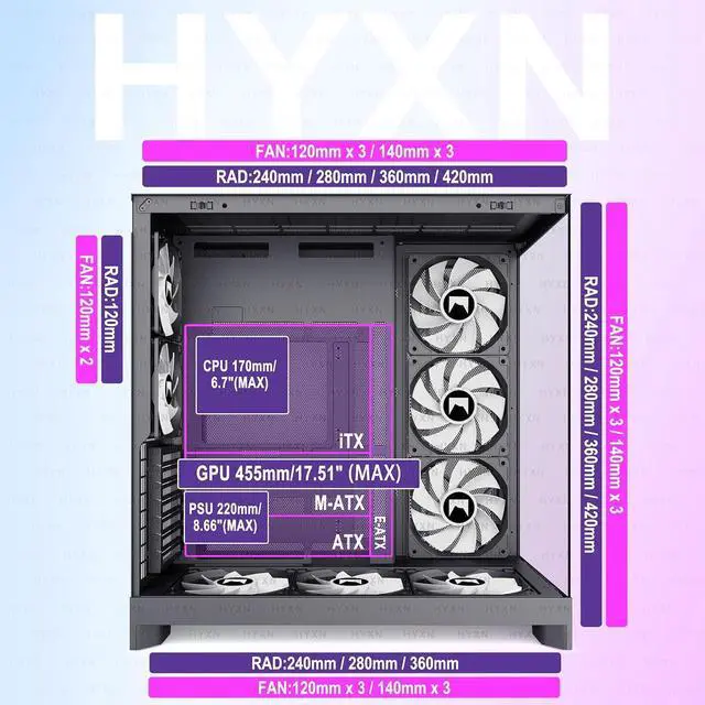 E-ATX/ATX/M-ATX/ITX motherboards, supports GPUs up to 455mm (17.91 inches), accommodates PSUs up to 220mm (8.66 inches), supports 2xHDD and 3xSSD, compatible with back-mounted motherboards, (Dimensions: 500*285*485mm/19.7* 11.2*19.1)