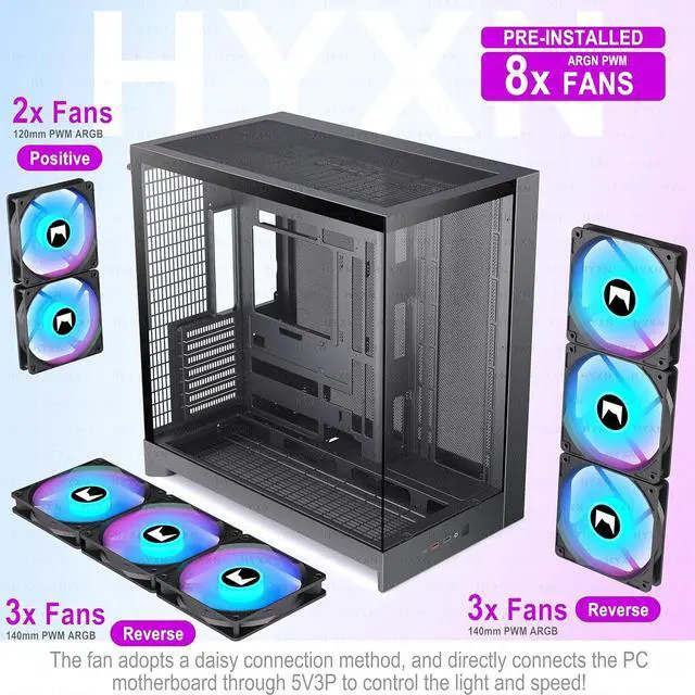 Includes 8 ARGB PWM fans (6x140mm reverse, 2x120mm forward).
