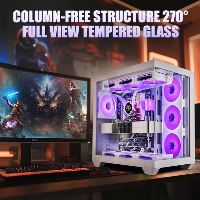 Practicality and style blend seamlessly in the Gaming Computer Case. Its sleek rectangular design keeps your desk neat and looks elegant. The two ultra-clear tempered glass panels allow natural light to pass through. Moreover, the tough glass is not only hard to break but also excellent at soundproofing, ensuring a comfortable workspace for work or gaming.