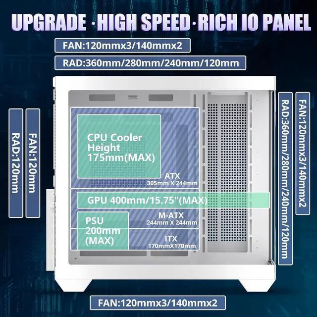 LINEDEPOT has really organized the inside of this Gaming PC Case well. The installation spots are cleverly designed, ensuring no problems when installing powerful hardware. Gamers can fully enjoy building their setups as they please. It's compatible with most popular hardware, supporting 400mm (15.7") GPUs, 175mm tall CPU coolers, a 360mm liquid radiator on top, and 200mm (7.87") power supplies.