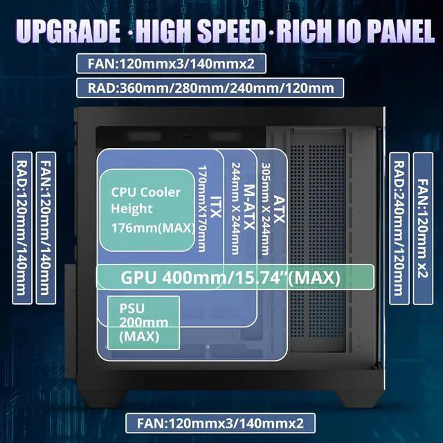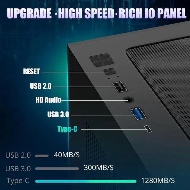 Upgrade Your High-Speed IO Panel - The LINEDEPOT PC case is loaded with external ports for great value. 1 TYPE-C high speed interfaces, 1 USB 3.0 and 1 USB 2.0 ports, making it effortless to connect new devices and enjoy faster transfer speeds, reducing waiting time. With a better power supply, a Reset button and an AUDIO jack, it meets all your needs for daily work and gaming fun.