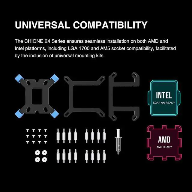 Universal Compatibility for INTEL & AMD Platform The CHIONE E4 Series ensures seamless installation on both Intel and AMD platforms, including LGA 1700 and AM5 socket compatibility, facilitated by the inclusion of universal mounting kits.
