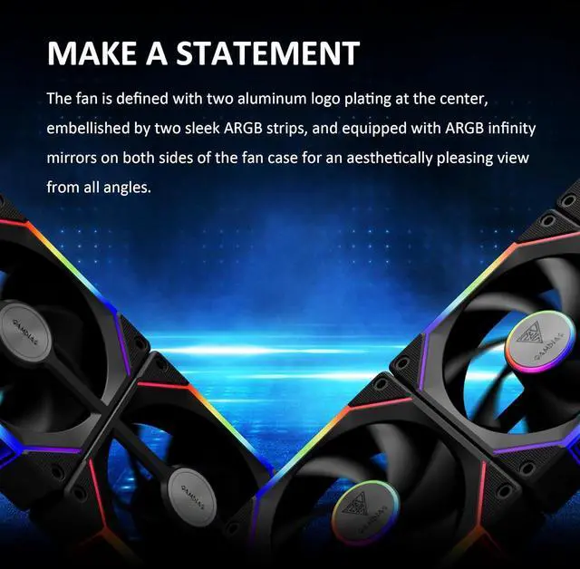 Sleek and Infinity Mirror RGB Case Fan Style: The case fan is defined with two aluminum logo plating at the center, embellished by two sleek ARGB strips, and equipped with ARGB infinity mirrors on both sides of the fan case for an aesthetically pleasing view from all angles