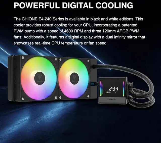 Upgraded PWM Pump: The CHIONE E4-240 features a patented PWM pump operating at 4600 RPM positioned on the side of the radiator, providing elite performance and extending lifespan due to reduced bracket vibration. Additionally, the detachable chamber streamlines the fan installation process.