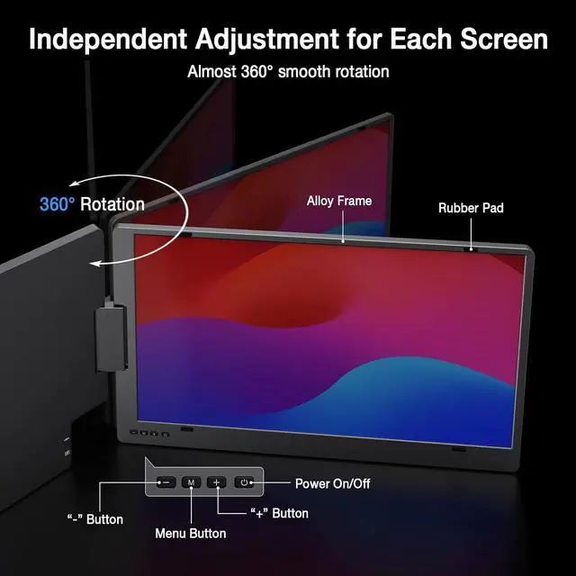 [ Versatile Foldable Portable Screen for Laptop ] With 360° rotatable screens and 1080P FHD IPS screens, this triple portable monitor for laptop allows 178° visual wide viewing angle, you can easily adjust your laptop screen for a perfect multi-screen display experience. The 90° adjustable kickstand ensure a secure and stable viewing experience, and secure and won't wobble during use