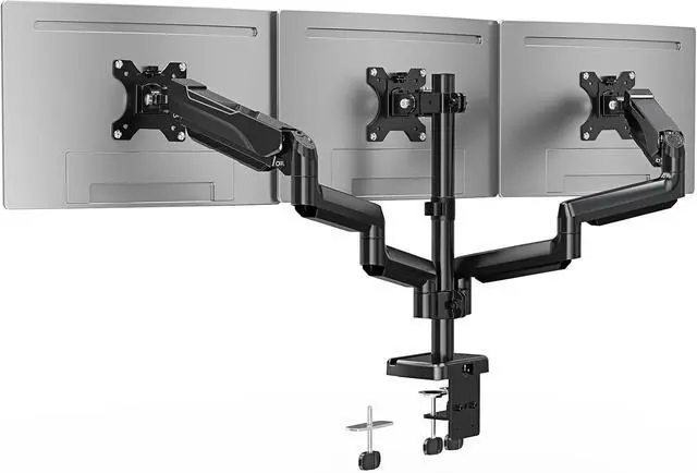 Wide Compatibility - Upgraded 3 monitor stands for 3 monitors, and widely fits most 13" to 32" flat/curved computer screens, including but not limited to 17 18 19 20 21 22 23 24 25 26 27 32 inch computer monitor. Heavy-duty three monitor desk mount holds up to 19.8 lbs per arm, compatible with 75x75mm and 100x100mm VESA patterns