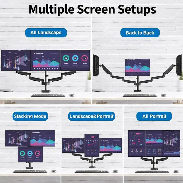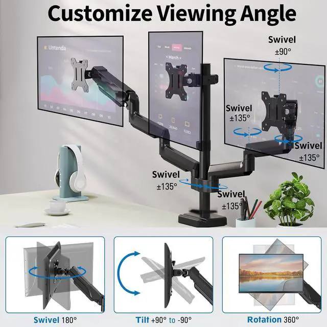 Optimize Your View - Our fully adjustable triple monitor arm offers a wide range of movement. Supports screen rotates 360° for landscape or portrait orientation, swivels 180° to share your display, and tilts up 90°/down 90° for better viewing. Plus, the 2 arms can easily extend, retract, and adjust the height dynamically. With multiple screen combinations, you can easily find the optimal viewing angle and position for comfortable work.