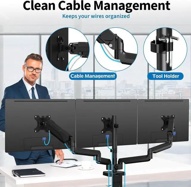 Maximize Your Desk Space - The 3 monitor stand mount get your monitor screen off your desk conveniently, helping you to gain a ton of extra space. Integrated cable management to keep cables tucked in arm neatly, hide the sore eyes wire clutter. Just enjoy your working, gaming, or viewing hours in a comfortable environment