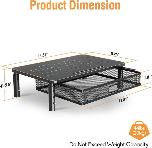 Product Dimensions - The platform is 14.57 x 9.25, suitable for most devices. The grid drawer is universal for storing kinds of office supplies and other items.