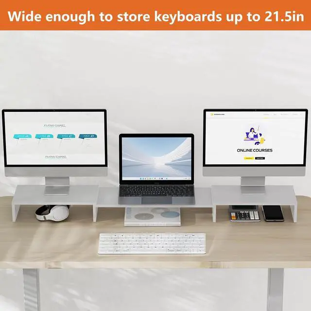 Extra Space for Keyboard: It comes with 3 shelves and we especially lengthened the middle board to 21.5" to suit most kinds of keyboards, also it can be used as a desk shelf with storage for your office files, notebook, calculator, etc. Helps make your table clean & neat!