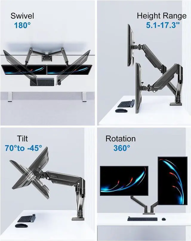 Boost Your Productivity : Say goodbye to the traditional inefficiency of working with two screens. Freelift gas spring dual monitor stand offers a perfect solution with its full-motion construction that allows for smooth, effortless rotation and positioning in any direction. Work comfortably at your desk for long hours.