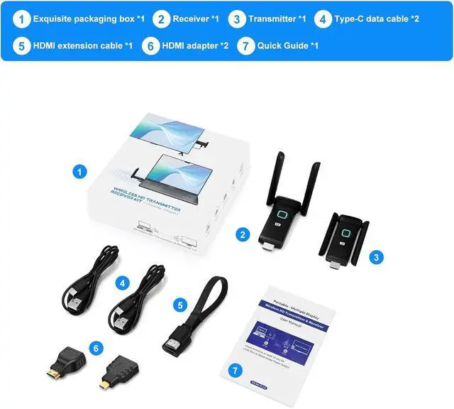 Universal Compatibility : This new upgrade wireless HDMI connector equipped with 3 accessories. USB C to HDMI 4K adapter/Micro HDMI adapter/Mini HDMI adapter, you will have both HDMI wireless and USB-C wireless at the same time.Seamlessly interfaces with most HDMI display devices on the market. Effortlessly cast content from laptops, PCs, cameras, set-top boxes, cable boxes, gaming consoles and more to HDTVs, projectors, monitors,smartphones, tablets, iPads. Note: If the HDMI wireless kit is used in an Apple TV box, the output resolution of the TV box needs to be adjusted to 1080P 60Hz.