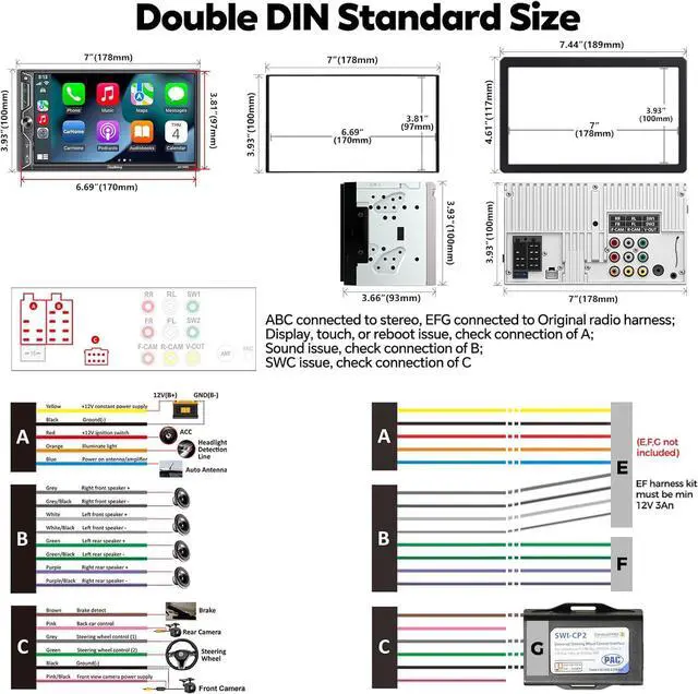 Measure Opening Size: Please read our stereo size carefully and measure your dashboard size, if the dimensions match one of the following three sizes, then our stereo will fit your model: Commonly used sizes for car series in the U.S. and Europe: 170*97mm(6.69*3.81inch); Commonly used sizes for car series in the Asian: 178*100mm(7*3.93inch); Other common sizes:189*117mm(7.44*4.61inch)