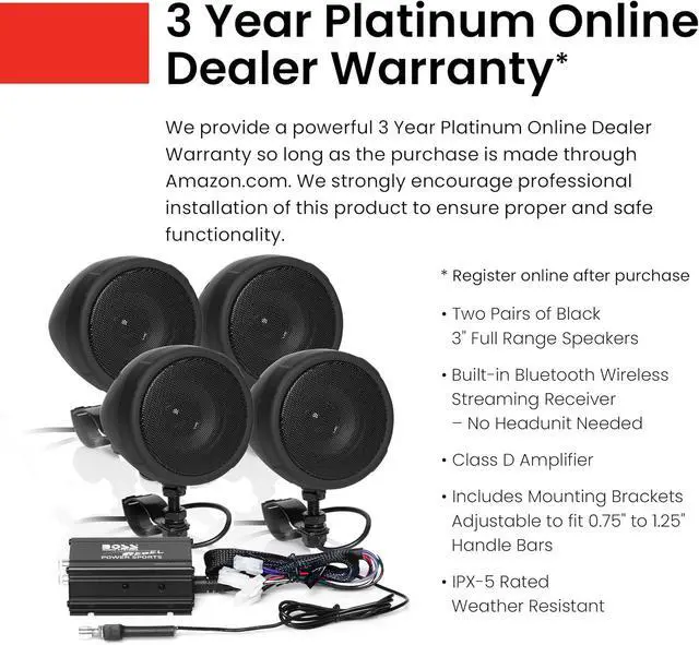 BOSS Audio Systems provides a powerful 3-year platinum online dealer warranty so long as the purchase is made through Amazon.com. We strongly encourage professional installation of this product to ensure proper and safe functionality