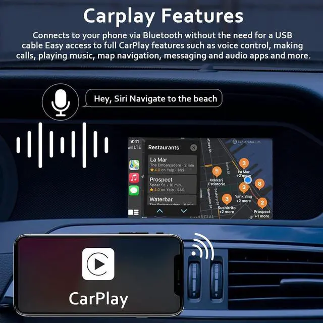 Wireless CarplayCARABC wireless adapter provides you with a smart and safe driving experience. Simply connect your phone via Bluetooth to receive and make calls, navigate, play music, and more while driving with voice control or with the car's existing buttons.