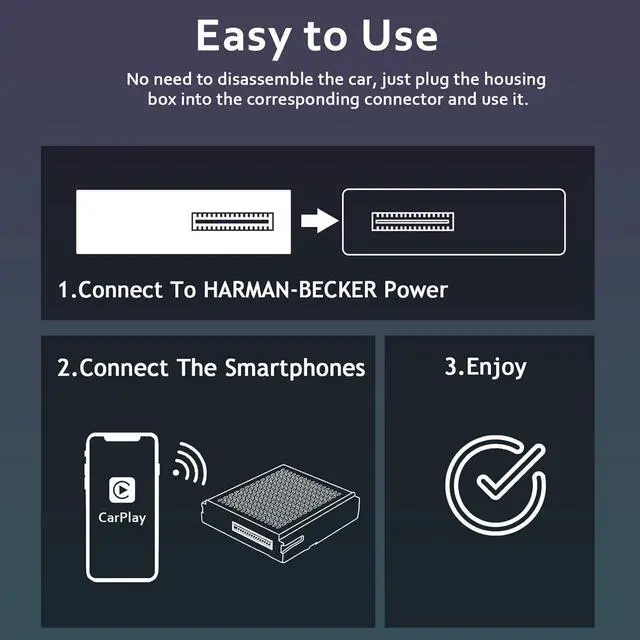Easy To UseSimply align and plug into the HARMAN-BECKER socket. It will unlock the CarPlay function. No need to dismantle the car and avoid car malfunction due to operation error.