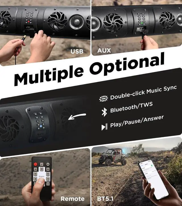 Engineered for Outdoor Adventures Say goodbye to rusting and warping metal soundbars. The Ehaho HK6802 is built with a durable, IP66-rated waterproof housing designed to be rust-proof from the start. It's built to handle it all, from freezing -20°C cold to scorching 70°C heat. Includes 1"-2" adjustable roll bar clamps + universal brackets for UTV side by side, SXS, ATV, RZR, or off-road vehicles