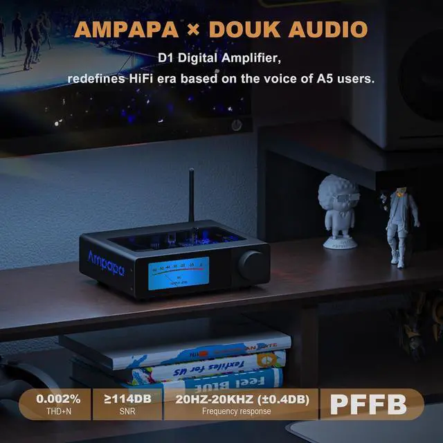 Ampapa × Douk Audio Collaboration: Built on the acclaimed Douk Audio A5 amp, the D1 retains core features like TPA3255 chip, HPF, PRE-OUT, socketed op-ampsnow upgraded with digital VU display, TRS balanced input, Bluetooth 5.2, treble/bass control, remote and more for next-gen HiFi performance.