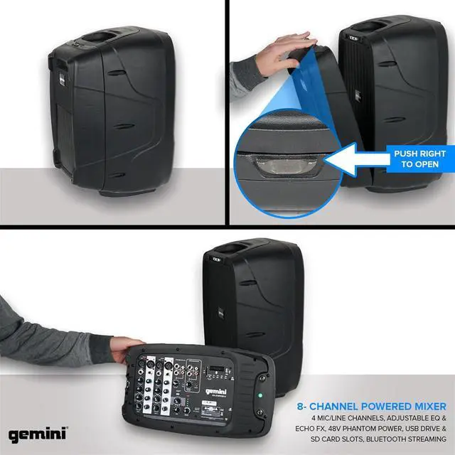 COMPLETE ALL-IN-ONE PA SYSTEM WITH HIDDEN STORAGE: Includes everything you need: 6-channel powered mixer, two 10" passive speakers with built-in rear storage compartments, two adjustable speaker stands (up to 74"), wired dynamic microphone, all cables, and storage container. The innovative snap-latch rear compartments keep your mixer and cables protected during transport. Total system weight: 48.5 lbs. Perfect for mobile DJs, small-to-medium events, karaoke nights, and church services.