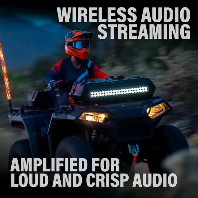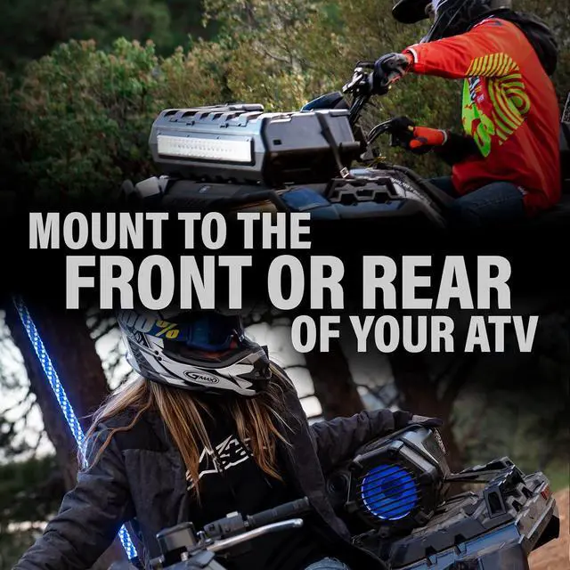 • CONTENTS: ATV Speakers, Remote Control for LED Lights, (4) Heavy Duty Straps with Velcro for any Mounting Position
