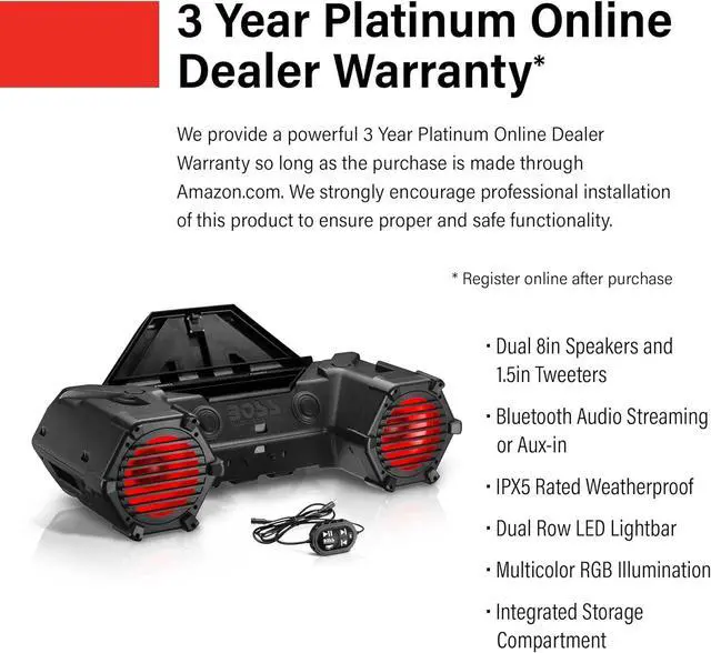 • WARRANTY: BOSS Audio Systems provides a powerful 3-year Platinum Online Dealer Warranty