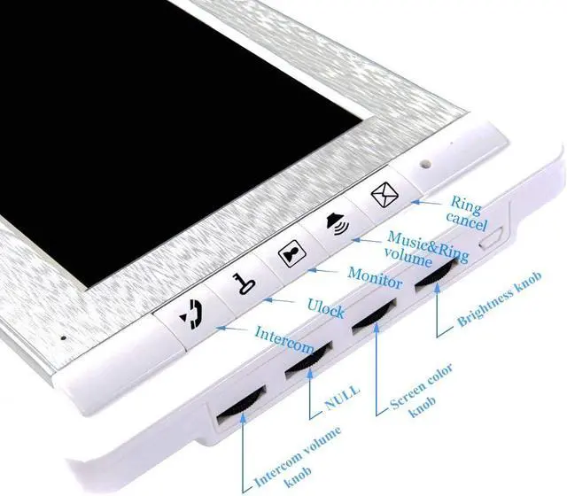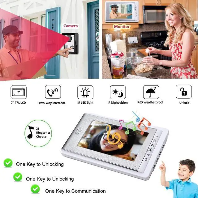 When someone press the button of the doorbell, the 7" monitor will ring and show the video,you can monitoring and unlock,dual-way intercom,Mute door intercom.