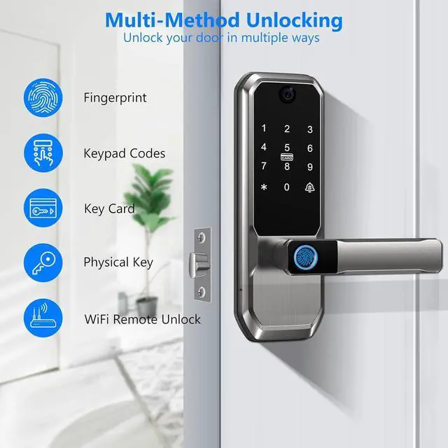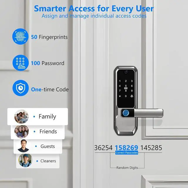 Multiple Unlocking Methods for Every Scenario: This keyless entry door lock with handle offers five unlocking options: fingerprint, PIN code, IC card, app control, and a traditional backup key. Ideal for various settings like apartments, offices and homes, you can easily assign personalized codes for different family members or users. Ideal for multi-user households, this door lock ensures convenience and security for all your family members.