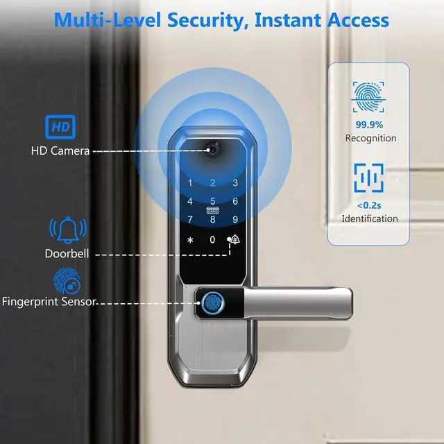 Modern Smart Home Experience: Enjoy quick and accurate fingerprint recognition with a success rate of 99% and an unlocking speed of just 0.2 seconds. Store up to 50 fingerprints for fast access. The built-in HD camera and smart indoor display let you see visitors at the door without needing your phone. The 3-in-1 video doorbell smart lock ensures full front door security, allowing you to view and speak to visitors anytime, enhancing your smart home experience.