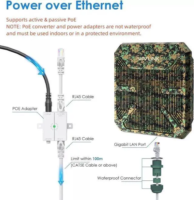 IP67 Outdoor WiFi Extender Weatherproof:Designed for harsh outdoor conditions, equipped with IP67 waterproof enclosure, 15kV ESD protection and 6kV lightning protection, it can work normally in rain/snow/wind/thunder and other bad weather. Note: The PoE converter is not waterproof