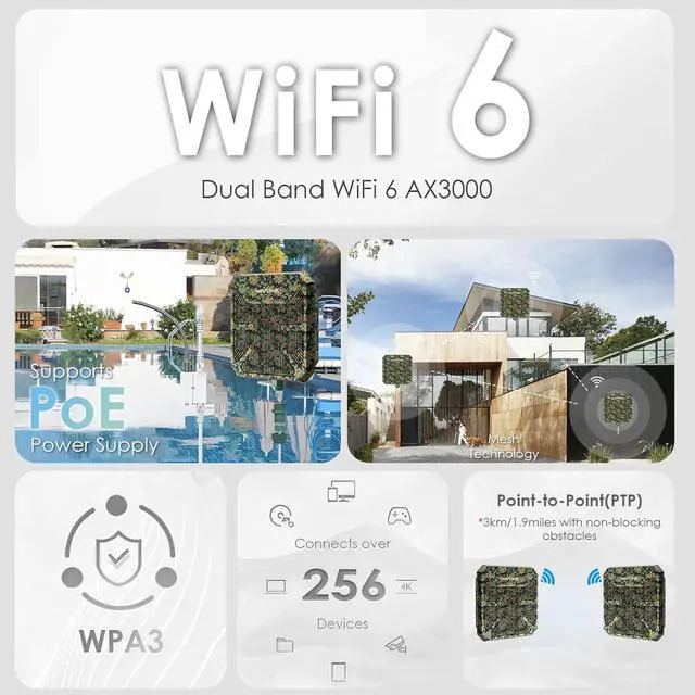 AX3000 WiFi 6 Dual-Band Speeds:The outdoor WiFi 6 extender, complies with IEEE 802.11 ax/ac/a/b/g/n standards. Supports dual-band maximum speed up to 5GHz 2402Mbps and 2.4GHz 573Mbps, avoiding wireless interference & congestion and offering lightning-fast Internet speed. Also supports Everything Mesh technology, one-click brings more device connections, greatly expanding the WiFi coverage, Up to 256 devices. Work with Starlink