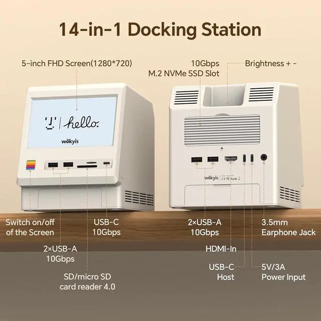 M5 Retro Dock Station for Mac mini M4, 5inch HD Display, 10Gbps M.2 NVMe SSD Enclosure, SD/Micro SD Reader 4.0, 4*USB-A 1*USB-C 10Gbps, 3.5mm Earphone Jack,