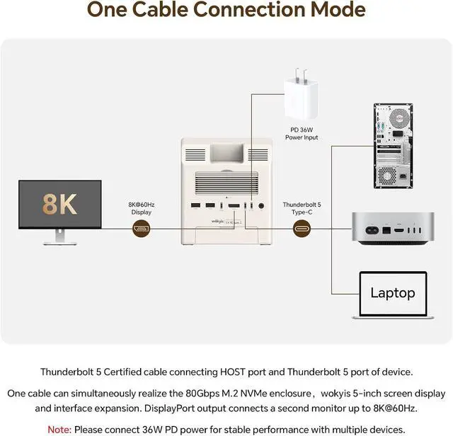Retro Mac mini Dock with Modern Performance:Classic Macintosh-inspired design combined with todays technology. More than just a Mac mini dock its a powerful productivity hub that transforms your desktop. Equipped with USB-C host connected to the Thunderbolt interface of Mac mini M4, 80Gbps M.2 NVMe SSD Enclosure with Cooling Fan, Compatible with Thunderbolt 5/4/3/USB 4, 5inch HD Display, SD/Micro SD Reader 4.0, 8K@60Hz Displayport output, 4*USB-A + 2*USB-C 10Gbps, 3.5mm Earphone Jack. A true multifunction hub that simplifies connectivity.