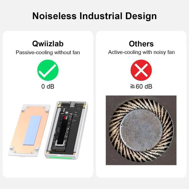 Qwiizlab Fanless 80Gbps NVMe Enclosure with Aluminum Chassis, Compatible with Thunderbolt 5, Backward Compatible with Thunderbolt 4/3 and USB4, Support PCIe M.2 SSD up to 8TB (Silver)