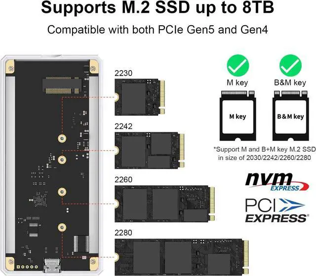 Note This Before You Buy: This product does not include any SSD. It supports both PCIe Gen 5 (PCIe 5.0) and Gen 4 (PCIe 4.0) NVMe M.2 SSD in size of 2280/2260/2242/2230mm up to 8TB capacity.
