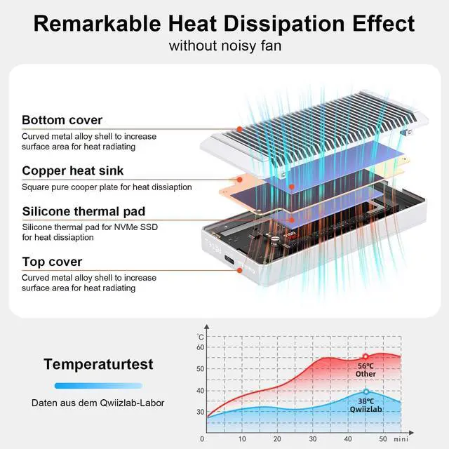 Rugged and Fanless: Encased in a sleek and grooved aluminum body, it stays cool without a fan, using internal copper plate to dissipates the heat from the M.2 NVMe SSD.