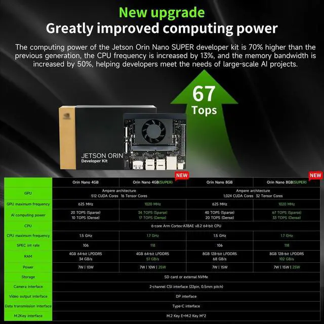 Core ParametersAI Perf: 34/67 TOPS GPU:1024-core NVIDIA Ampere architecture GPU with 32 Tensor Cores CPU:6-core Arm Corte-A78AE v8.2 64-bit CPU 1.5MB L2 + 4MB L3 Memory:8GB 128-bit LPDDR5 68 GB/s Storage: external NVMe via M.2 Key M