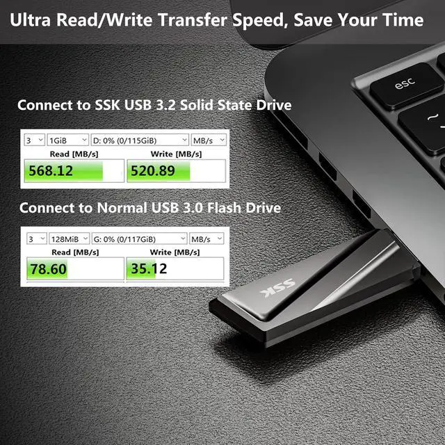New Ultra-High-Speed Transmission: SSK USB 3.2 flash drive provides up to 550MB/s read speed and 520MB/s write speed which is 10 times faster than conventional USB 3.0 memory stick. More importantly, the speed does not drop during the transmission and the condition of capacity use. It is suitable for daily movement of large-capacity files and photos. According to internal testing, performance may vary slightly due to factors such as host equipment, interfaces, and usage conditions