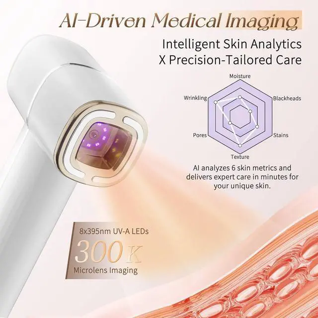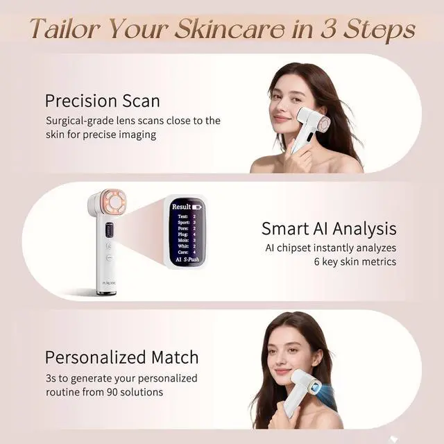 [AI-Powered Skin Analysis in 3 Seconds] Built-in 300K-pixel camera and smart AI chip analyze your skins hydration, pores, and texture in real time. In just 3 seconds, it selects the best match from 90 care routinessay goodbye to one-size-fits-all skincare and start treating your skin the way it truly needs.
