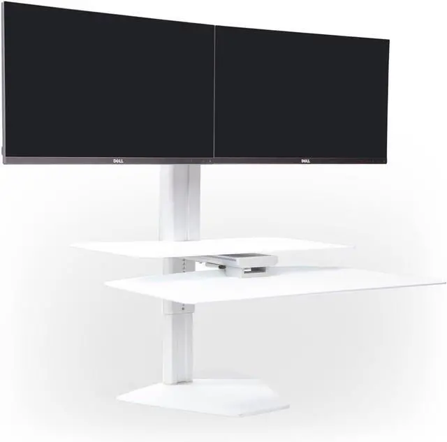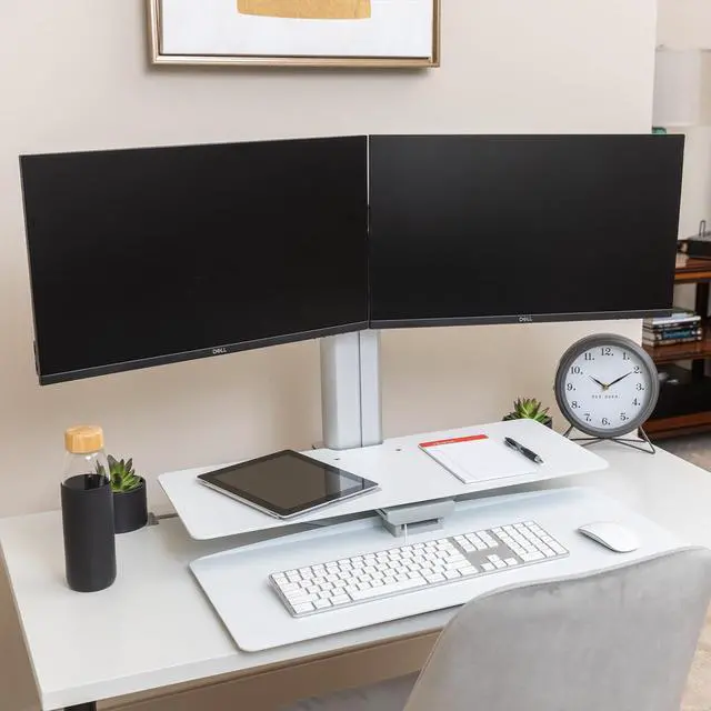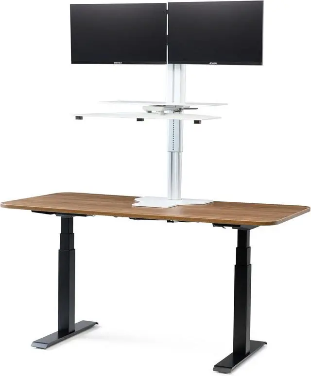 BUILT FOR MOVEMENT The Sit2Stand standing desk converter transitions from sitting to standing with just one hand using a single-lever adjustment. The dual monitors (not included), keyboard tray, and worksurface are all raised and lowered together seamlessly, supporting better posture at any height.
