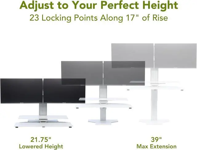 PRECISE HEIGHT CONTROL Customize your ergonomic desk position with up to 18 inches of vertical adjustment and 23 locking points for personalized comfort.