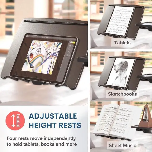 FITS MOST DEVICES & TILTS 0°70° FOR ERGONOMIC VIEWING Holds notebooks up to 16 wide (5 lb max), plus tablets, sketchpads, books, or documents. Tilts from flat to 70 degrees for ideal posture whether sitting, reclining, or lying down. Includes safety bungee to secure your device at any angle. Adjusts quickly between seated and standing positions, making it a versatile mobile workstation for home or office.