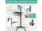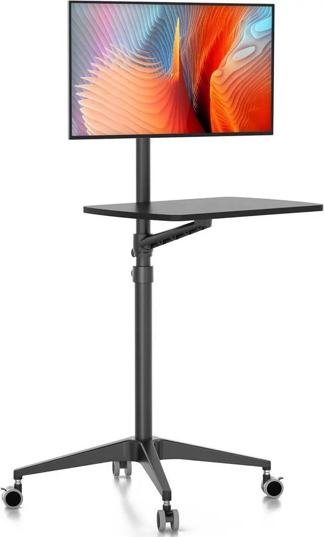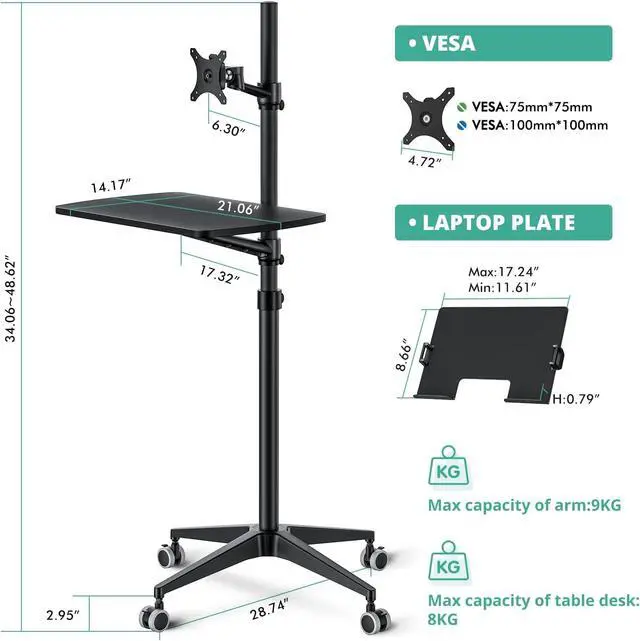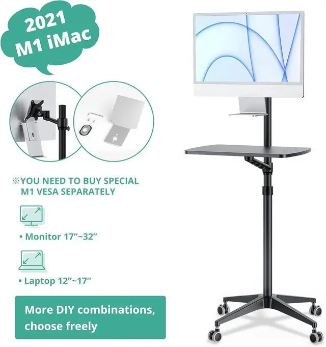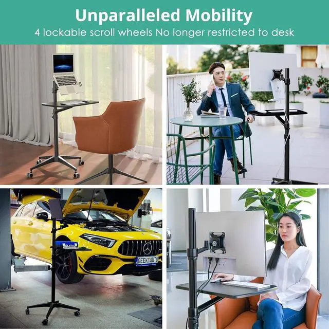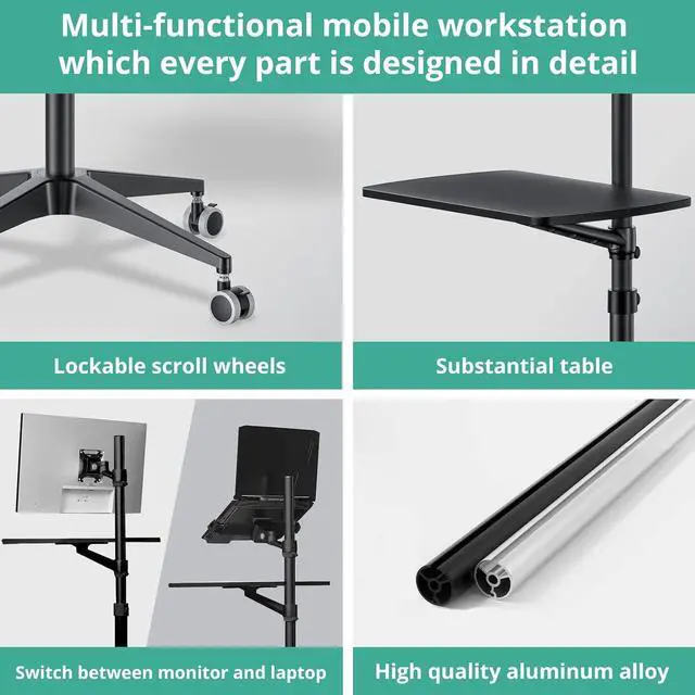 Multipurpose Mobile WorkstationMonitor arm, laptop stand, mobile desk, standing desk, portable podium, computer cart, any purpose you can imagine for a personel workstation, an independent equipment unit for your flexible daily work and life. This mobile stand can be use such as a rolling laptop stand, a presentation podium, a gaming unit, a movie station, a media studio, a medical workstation, etc. Note: Please check and increase tension if you want to switch to a heavy monitor.