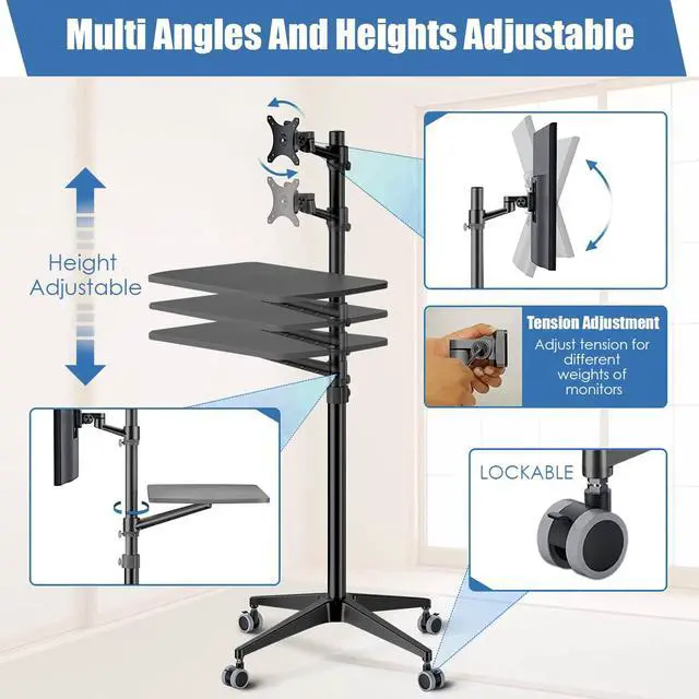 Multiuse Mobile WorkstationMonitor arm, laptop/keyboard desk, standing desk, portable podium, This mobile stand can be use such as a rolling laptop stand, a presentation podium, a gaming unit, a movie station, a media studio, a medical workstation, school/lecture. Note: Please check and increase tension if you want to switch to a heavy monitor. Make it sure your Monitor has the Vesa Hole on the back meaning it is vesa compatible( If not , you may need another vesa adaptor that is not included)