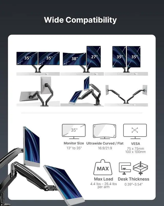 mproved Stability for Ultrawide Monitors: The upgraded dual monitor stand combines solid aluminum arms, a larger base, and a unique dual C-clamp design built to support heavier monitors. It securely holds two 13 40 screens weighing up to 26.4 lbs and supports VESA 75×75mm or 100×100mm.