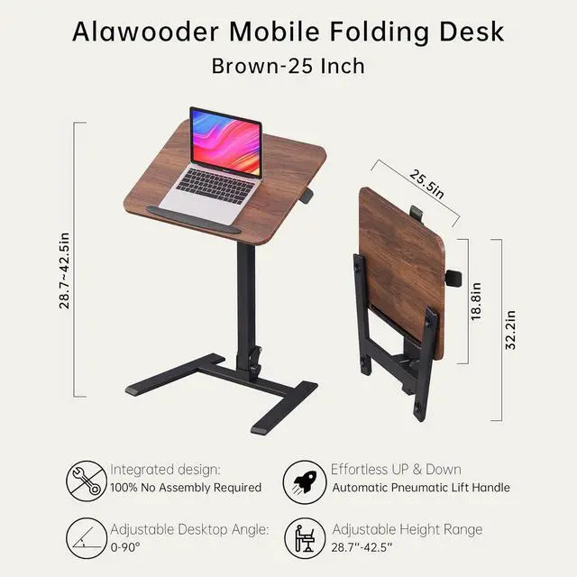 25 Inch Mobile Folding Desk - No Assembly Pneumatic Sit-Stand Desk, 29-42" Height Adjustable Rolling Laptop Desk with Hidden Wheels, 0-90° Tilt Top for Home Office, Craft & Study
