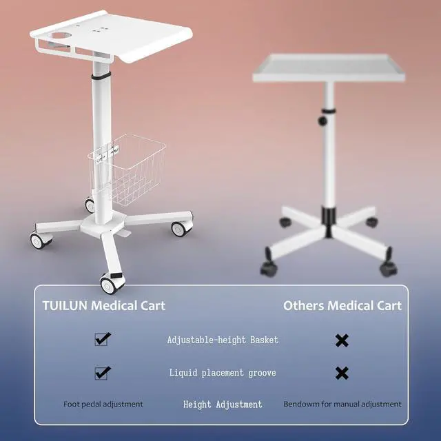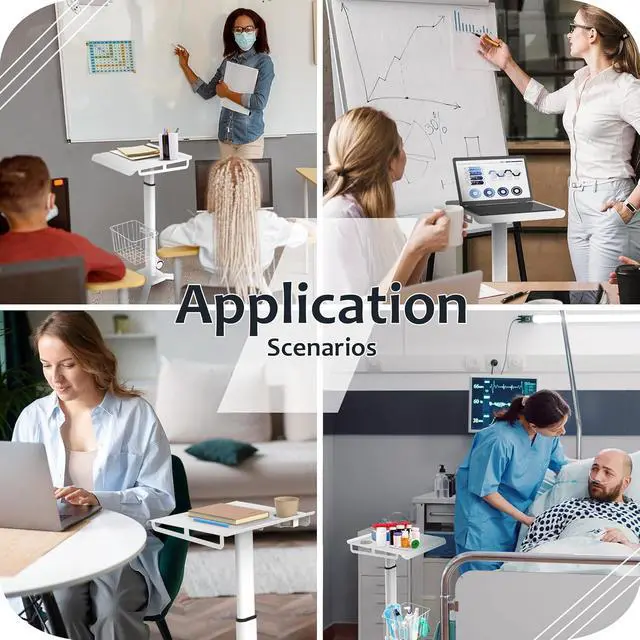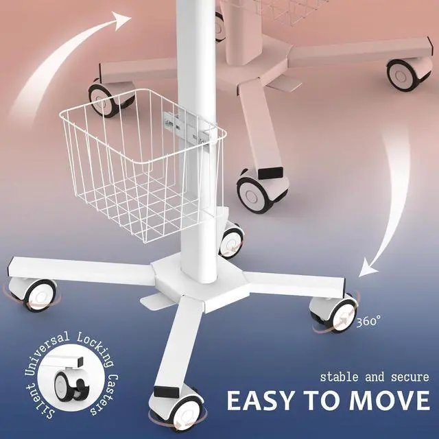 Flexible and Versatile Design: Integrated into the computer cart on wheels, this workstation desk is well-suited for a variety of environments, including medical facilities, office spaces, and other professional settings, ensuring practicality and convenience across different contexts. The added features, such as the beverage placement groove, adjustable-height basket, enhance its adaptability and functionality, catering to a wide range of user needs in diverse work environments.