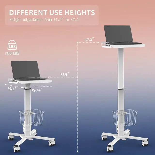 Adjustable Height: The adjustable height feature, operated through a convenient foot pedal, allows users to effortlessly modify the rolling computer cart's desk elevation from 31.5" up to 45.2". This intuitive mechanism facilitates seamless transitions between standing and sitting positions, catering to diverse user preferences and ergonomic needs.