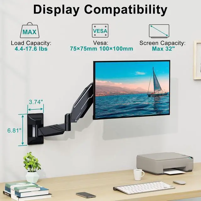 MOUNT PRO Monitor Wall Mount for 13 to 32 Inch Computer Screens, Single Monitor Mount with Tilt/Swivel/Rotation Adjustable, Gas Spring Wall Arm Holds up to 17.6lbs, Vesa Wall Mount 100x100