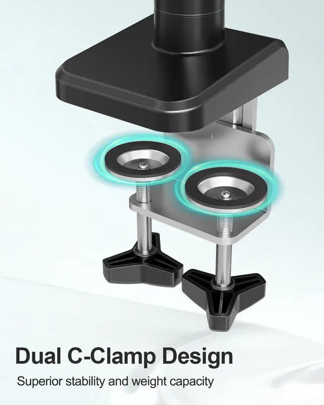 Excellent Stability with Wider C-Clamp - Unique wider C-clamp design, provides larger contact area with the desktop, forming a more stable support structure. It supports two mounting options: a C-clamp for desks 0.39"-2.76" thick and a grommet mount for 0.39"-2.36" thick desks