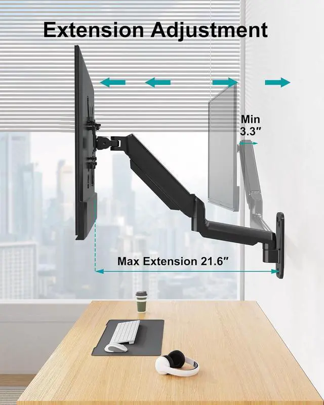 Full Motion Monitor Arm - This wall mount monitor arm adjusts your monitor to the perfect angle with our full motion adjustments feature. The adjustable arm tilt your screen from +90° to -90°, swivel it 180°, and rotate it 360° from landscape to portrait, providing you an optimal viewing angle. The wall monitor arm can be extended up to 21.6" and arm height adjusts up to 12.2", which relieves strain on your spine, neck, and shoulders.